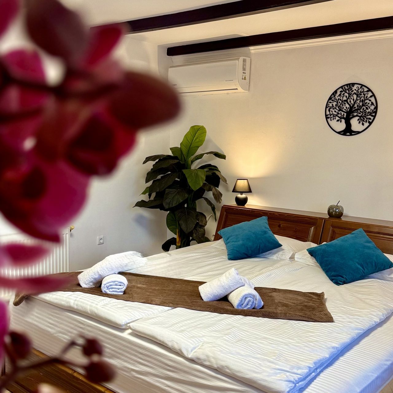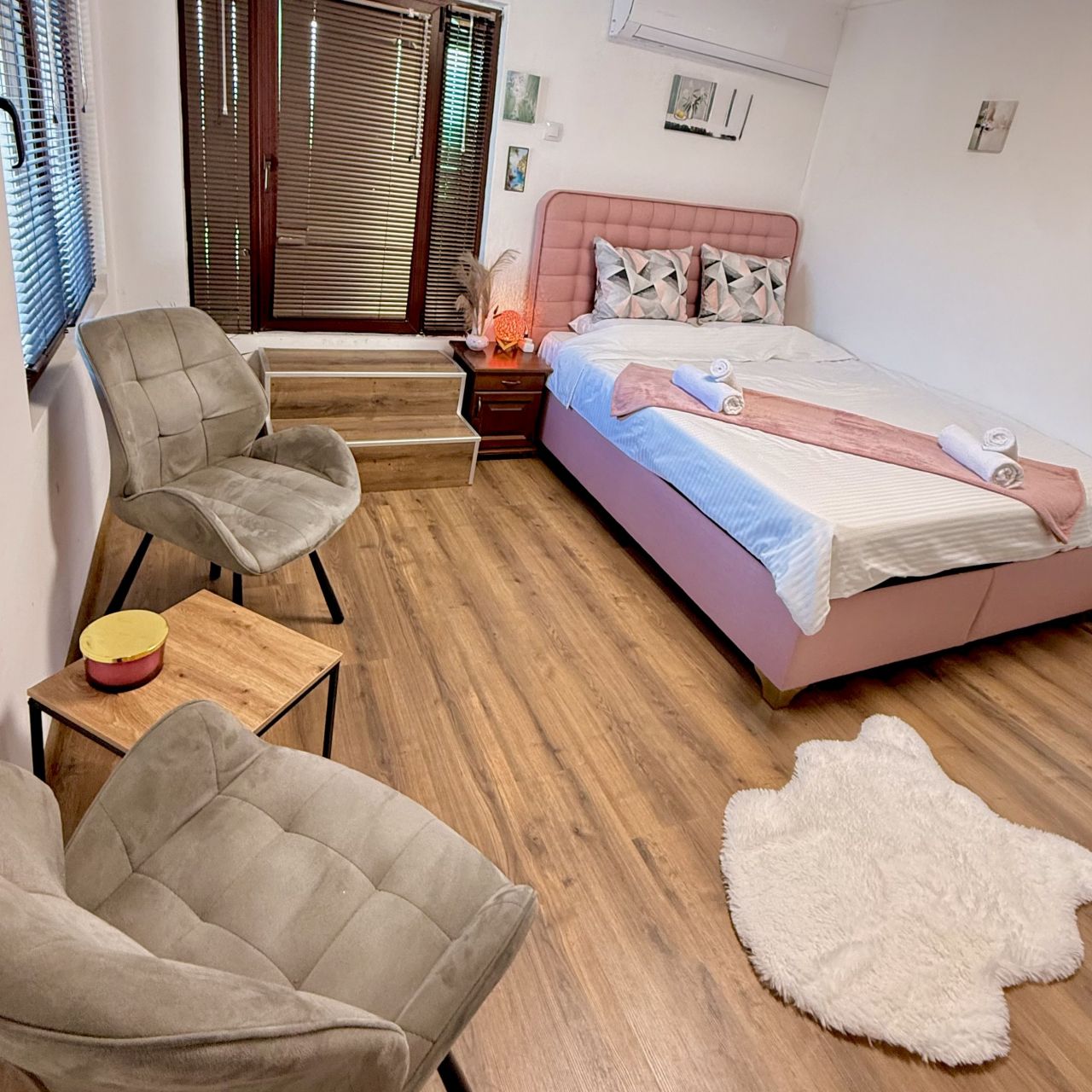 Къщата разполага с 4 просторни и уютни спални, три от които са с разтегателен фотьойл, подходящ за допълнително настаняване. Има и допълнителна стая с разтегателен двоен диван, което прави възможно комфортното настаняване на до 13 гости.