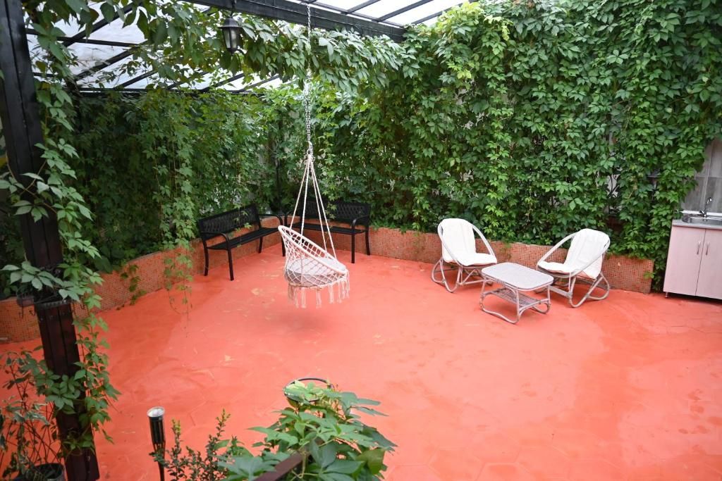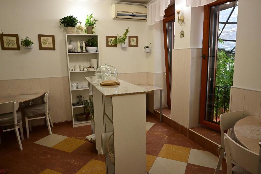 За гостите има 4 двойни стаи със самостоятелни сервизни помещения, обща тоалетна, кухненски бокс, трапезария и закрита зелена градина.