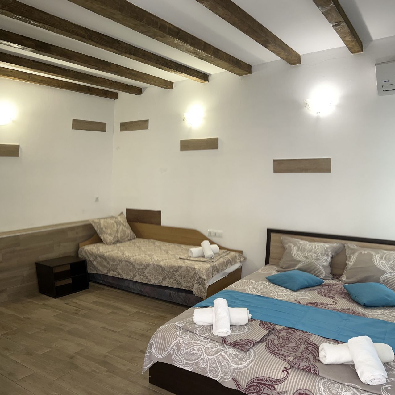 Тя предлага настаняване в самостоятелни двойни, тройни и четворни стаи. Всички те са със собствен санитарен възел, климатик, хладилник, кабелна телевизия и интернет.