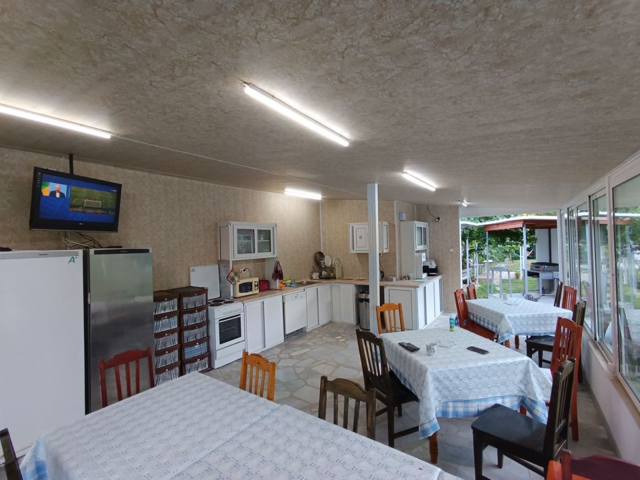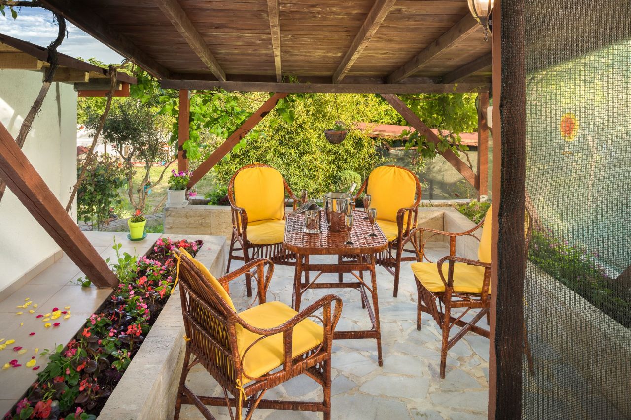 На ваше разположение е беседка със столова, напълно обзаведена кухня с пещ и барбекю, където всеки желаещ може да осъществи кулинарните си фантазии. По всяко време за вас напълно безплатно - кафе, чай и минерална вода.