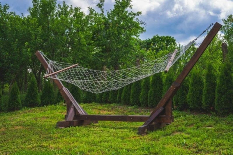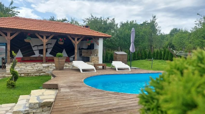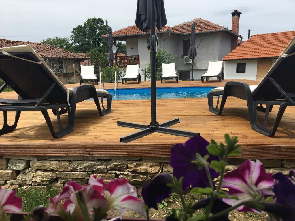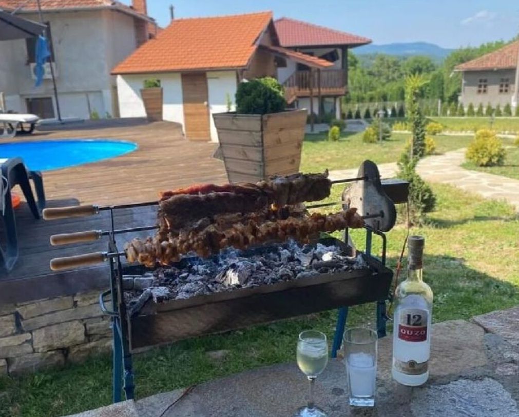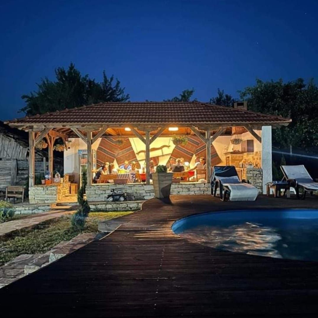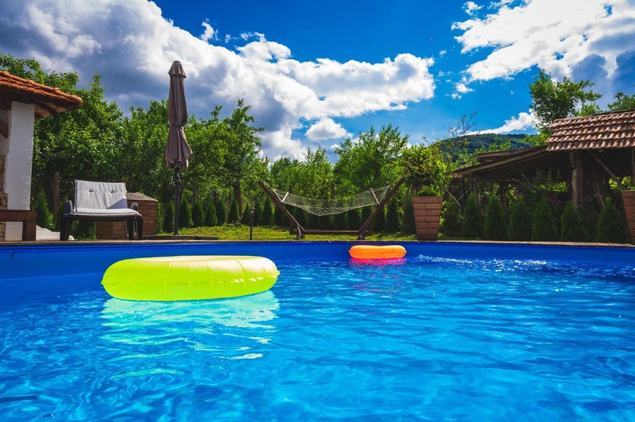 В двора на Вили Енчеви има голям басейн, хамак и закрит навес с камина.