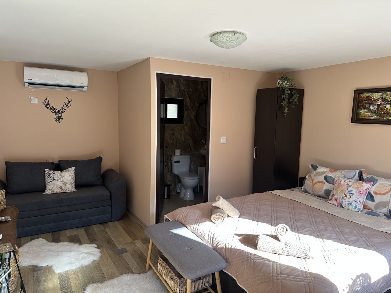 Разполага с 5 спални (12 места), всяка стая e с удобно двойно легло, гардероб, кабелна телевизия, интернет. Една от спалните е семейна, подходяща за семейство с 1 или 2 деца, а друга разполага със собствена камина и люлеещ се стол за пълна хармония.