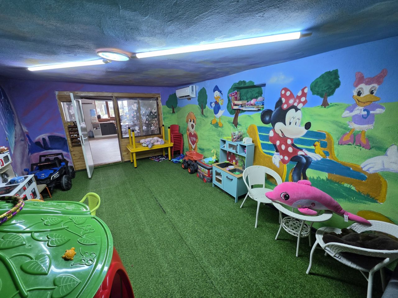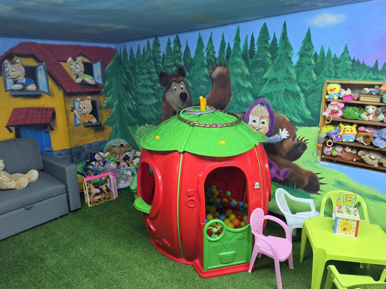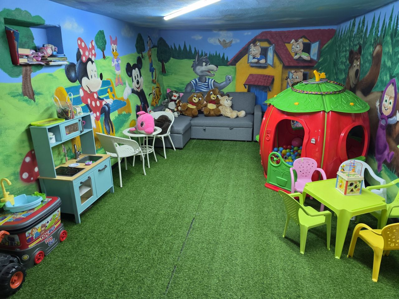 На разположение са: вътрешен детски кът с пързалки, басейн с топки и играчки; външен детски кът с батут и просторна детска площадка (100 кв.м); външна зона за родители, откъдето те могат безопасно да наблюдават децата.