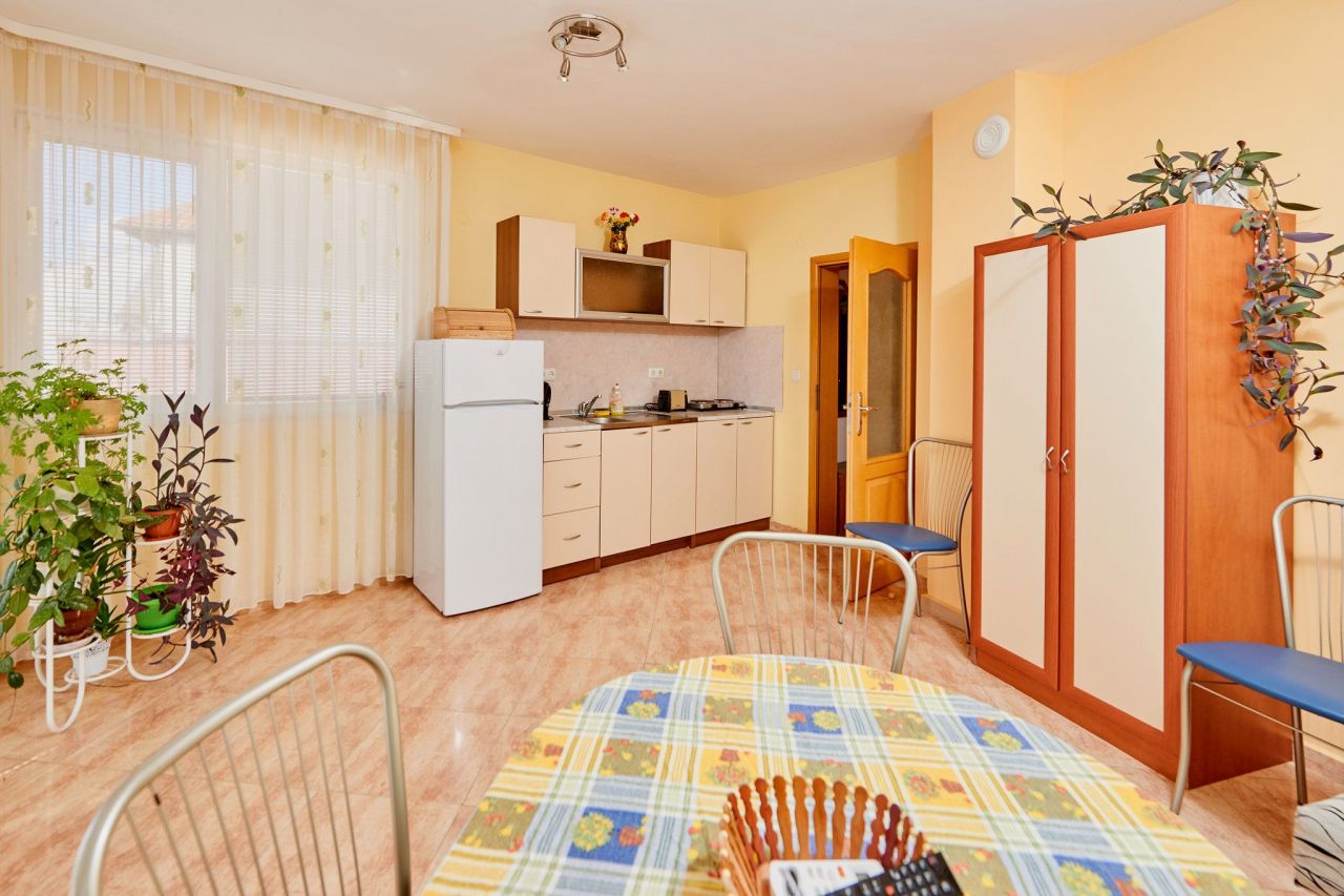 Студио - състои се от две преходни помещения, кухненски ъгъл с посуда и микровълнова, хладилник. В едното помещение има спалня, в другото разтегателен диван (допълнително легло) за един човек.