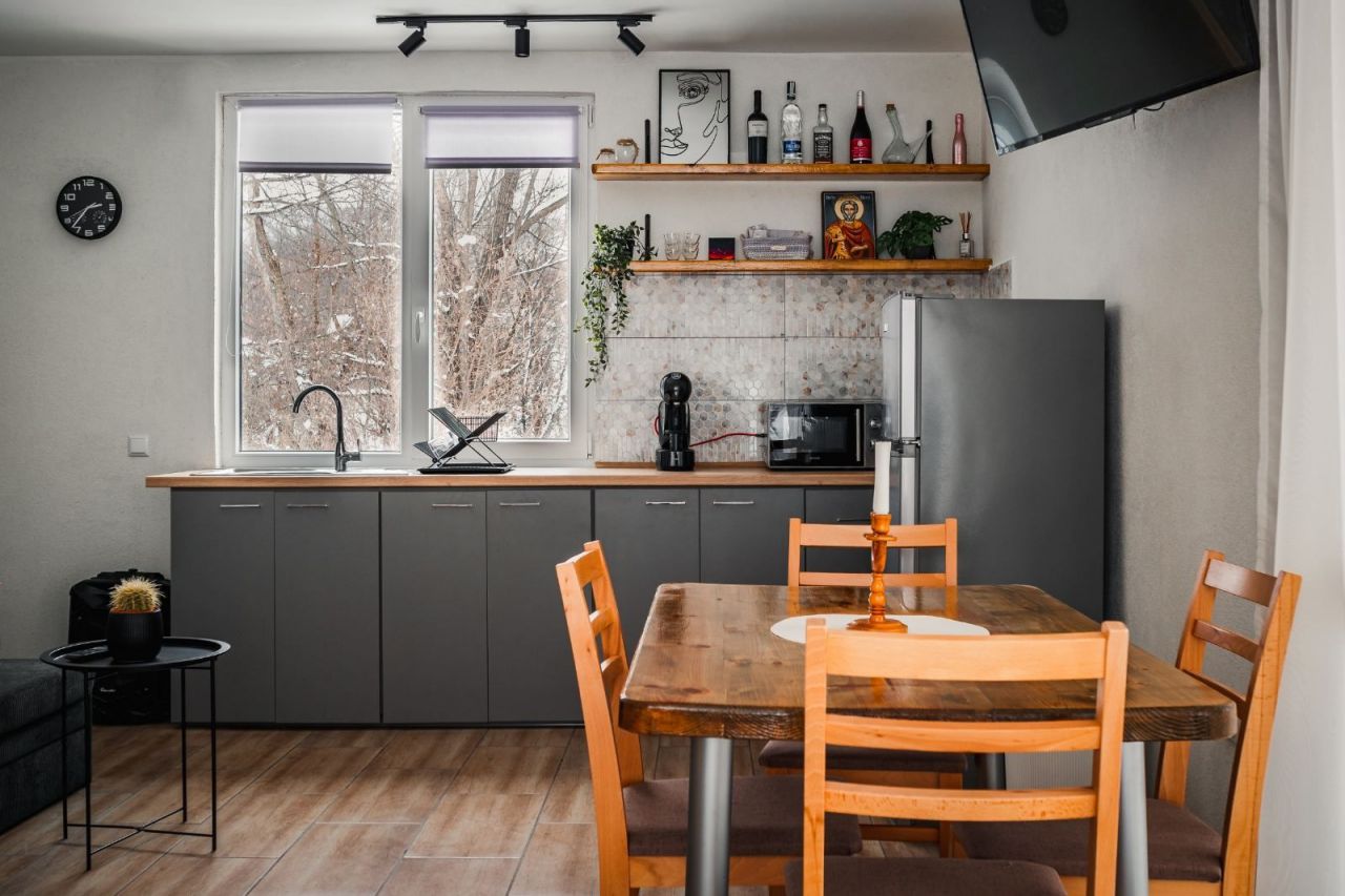 Оборудваната кухня включва всичко необходимо за готвене – хладилник, микровълнова, кафемашина и разнообразие от съдове и прибори.